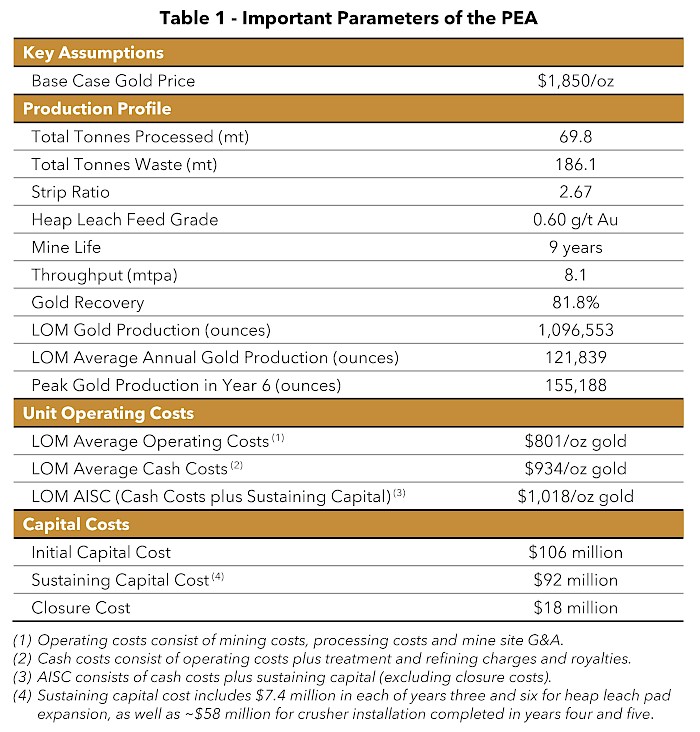 Cash costs are reflective of the cost of production. Cash costs reported in the PEA consist of mining costs, processing costs, mine site G&A, treatment and refining charges and royalties. Cash costs per ounce is calculated as cash costs divided by payable gold ounces.