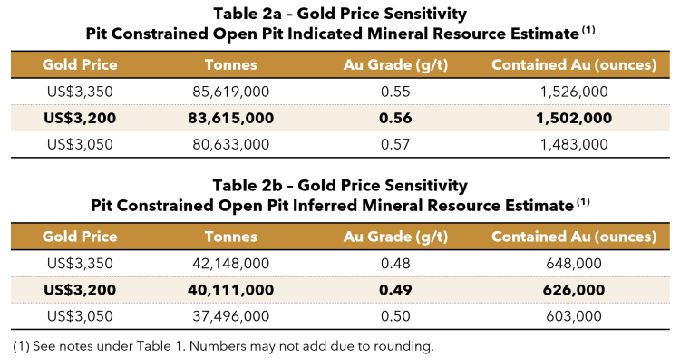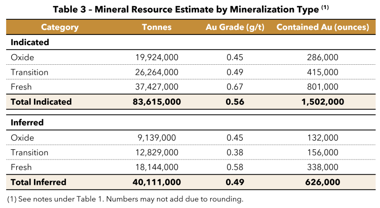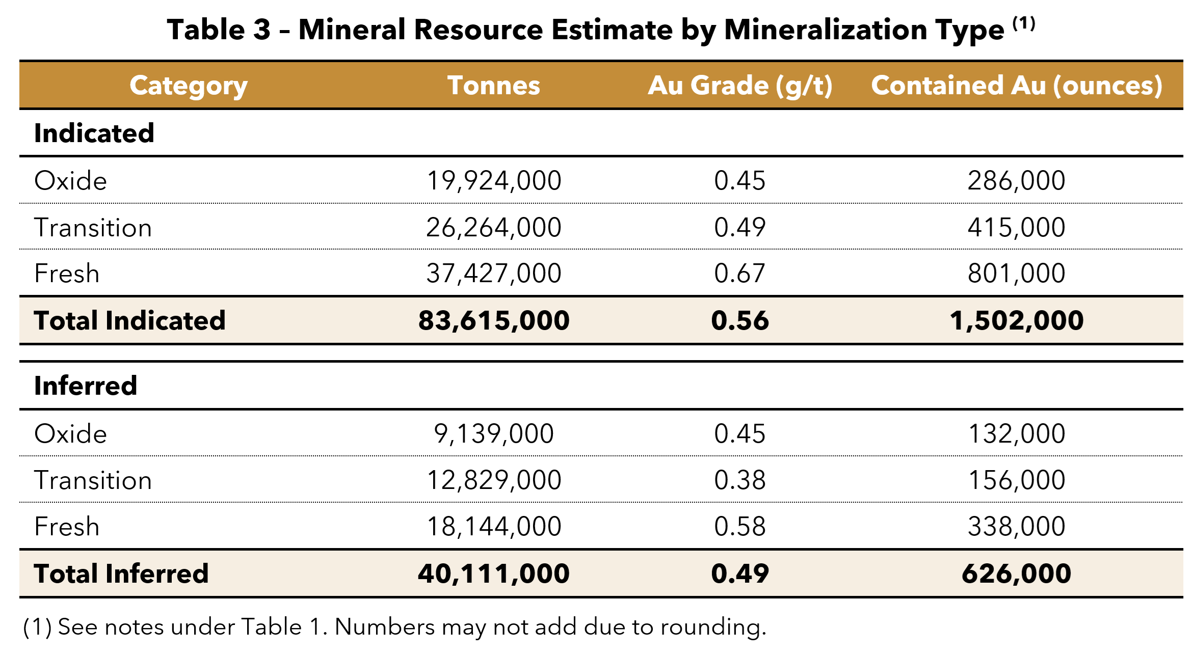 - Indicated Mineral Resource of 1,502,000 ounces of gold at an average grade of 0.56 g/t Au within 83.6 million tonnes, more than double the last Indicated Resource for the Project published in 2023 (see news release dated March 7, 2023).