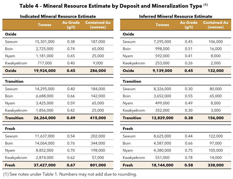 - Resource includes four pit-constrained deposits (Sewum, Boin, Nyam, Kwakyekrom), with all deposits open along strike and at depth with potential resource growth in shallow oxide and transition mineralization, as well as within the deeper fresh mineralization.