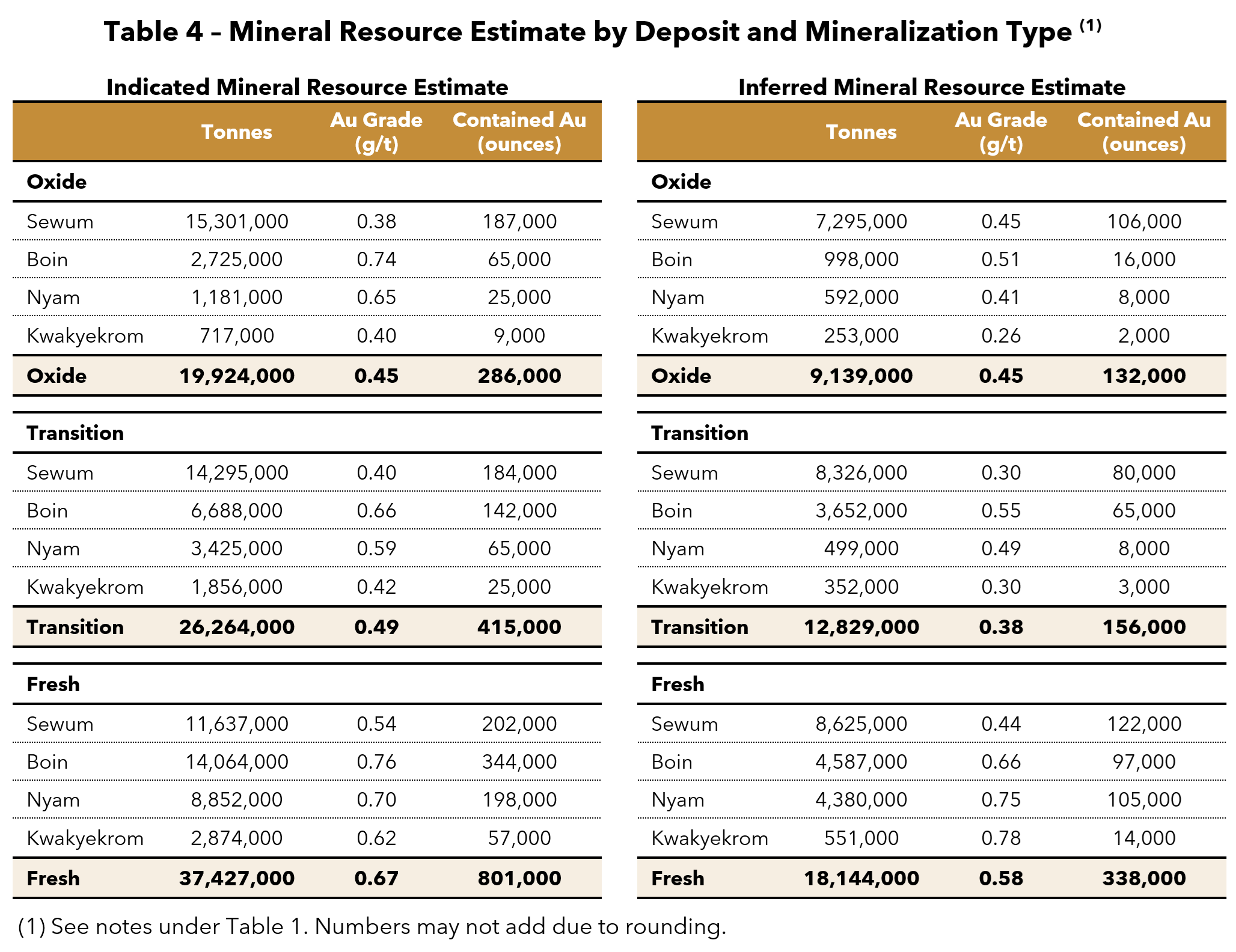 The updated Mineral Resource Estimate was prepared by independent qualified persons Ryan Wilson, P. Geo., Matthew Halliday, P. Geo., and Schadrac Ibrango, P. Geo of DRA Global Limited. Mineral resources are not mineral reserves and do not have demonstrated economic viability. There is no certainty that any mineral resource will be converted into a mineral reserve. The resource estimate is based on the combination of geological modeling, geostatistics and conventional block modeling using the Ordinary Kriging methodology of grade interpolation for Sewum, Boin, Nyam, and Kwakyekrom.