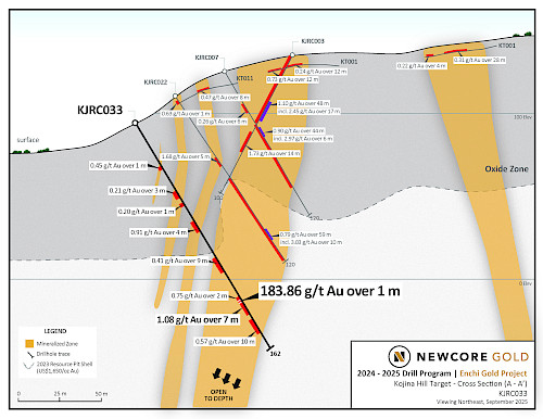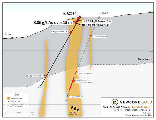 Greg Smith, Vice President of Exploration of Newcore stated, "Drilling completed at the earlier stage Kojina Hill Gold Target, an area at Enchi that does not yet have a mineral resource estimate, continues to highlight the potential for future resource growth both in the near-surface oxide mineralization in tandem with the high-grade zones encountered to depth across the district scale property. Drilling at Kojina Hill continues to showcase the potential for Enchi to host wide as well as high-grade mineralization, with RC hole KJRC033 our third-best interval encountered to date when calculated on gram by metre. With the second phase of the drill program now underway, we are excited to be drill testing multiple high-grade targets that we have identified at Enchi. Notably, with drilling to date focused on shallow mineralization, Enchi has only been drill tested to an average vertical depth of 125 metres. With mineralization at neighboring gold mines located along the Sefwi-Bibiani belt defined to much deeper vertical depths, we are excited to continue to define Enchi’s longer-term resource growth and value potential through the drill bit by advancing the potential that we believe exists at depth across our district scale property."